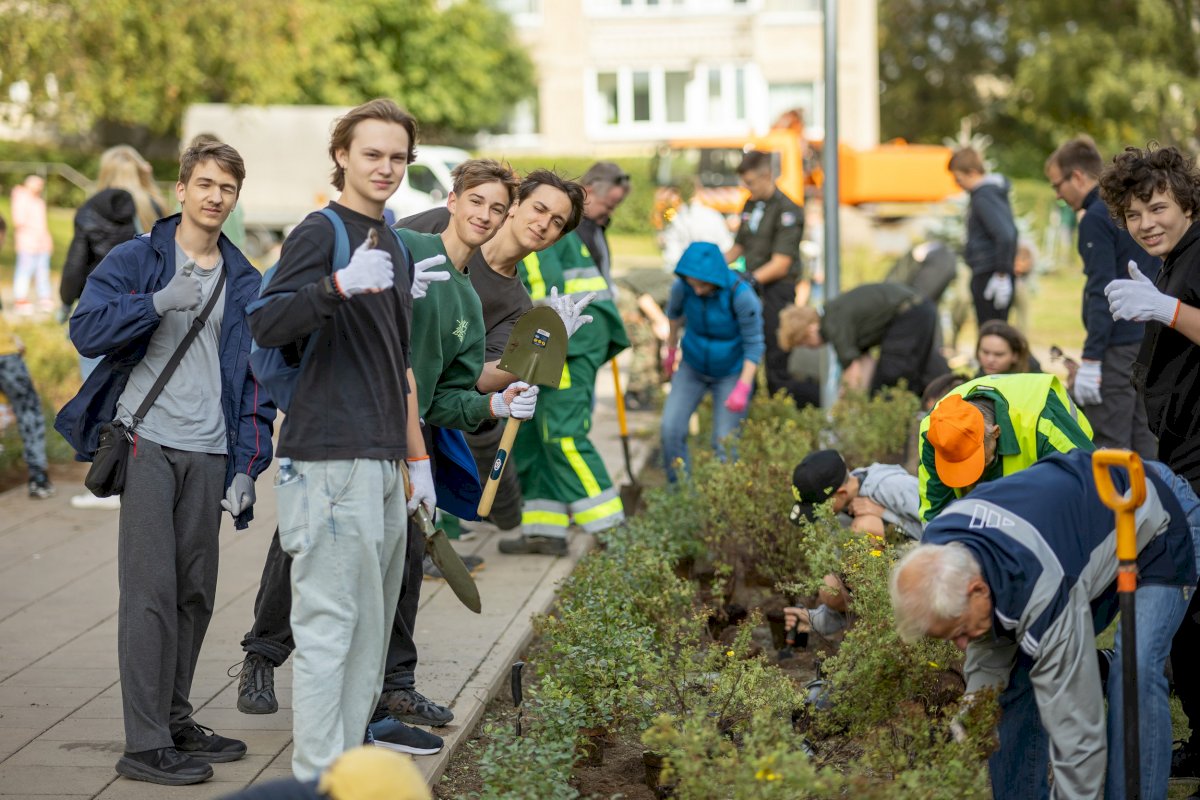 Gausus būrys talkininkų vos per valandą apželdino tarp daugiabučių esančią žaliąją erdvę.